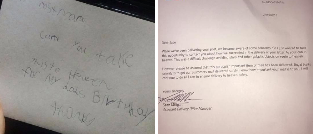 Απαντώντας στο φάκελο του Jase που ζητούσε να σταλεί στον ουρανό, ο Sean Milligan, υπάλληλος της Royal Mail δήλωσε: «Ήθελα απλώς να εκμεταλλευτώ αυτή την ευκαιρία για να επικοινωνήσω μαζί σας για το πώς πετύχαμε την παράδοση της επιστολής σας στον πατέρα σας στον ουρανό».