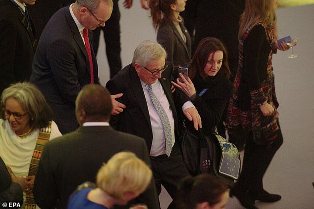 Φτάνοντας για το δείπνο, πρόεδρος της Κομισιόν μετά βίας μπορούσε να σταθεί στα πόδια του ενώ χρειάστηκε να τον στηρίξει μια βοηθός του ενώ ένας δεύτερος τον κρατά από πίσω για να μην πέσει.