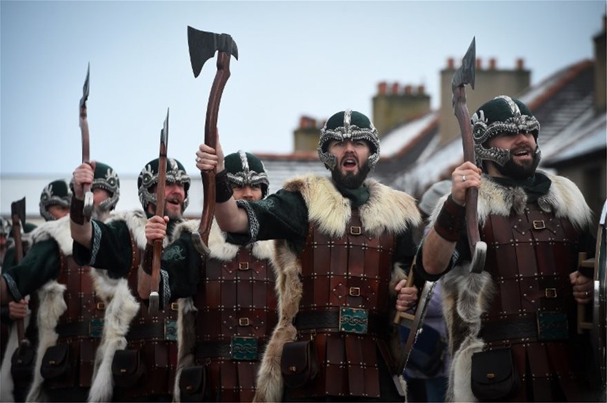 Τα πλήθη συρρέουν για να παρακολουθήσουν τους μεγαλόσωμους άνδρες με τα φτερωτά κράνη, τις προβιές, τα τσεκούρια και τις ασπίδες να βάζουν φωτιά σε ρεπλίκα πλοίων των προγόνων τους.