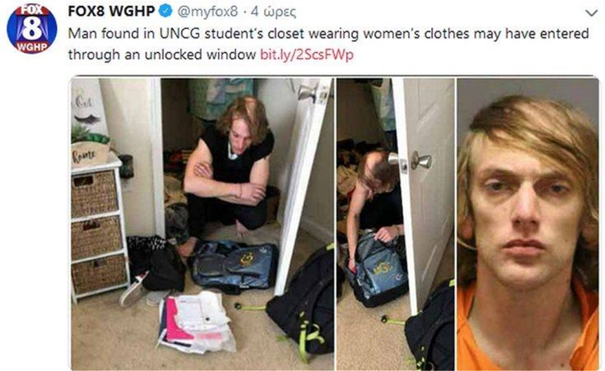 Όταν άνοιξε την πόρτα της ντουλάπας το σοκ ήταν ισχυρό: Ένας 30χρονος βρισκόταν μέσα στα ρούχα της! Ρώτησε «ποιος είναι εκεί;» η απάντηση ήταν: «Εγώ»! Ο 30χρονος βγήκε και συστήθηκε ως «Ντρου». Μαζί με τον άνδρα η φοιτήτρια είδε και όλα της τα ρούχα έξω καθώς ο εισβολέας τα φορούσε σχεδόν όλα.