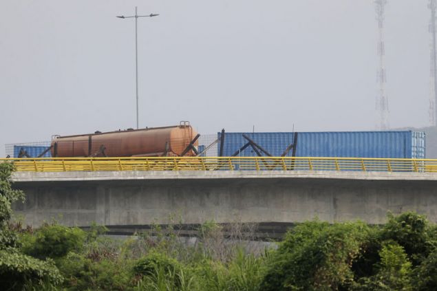 Στις εικόνες διακρίνονται δύο κοντέινερ κι ένα βυτιοφόρο να κλείνουν τα ρεύματα κυκλοφορίας στη γέφυρα Tiendidas κοντά στη μεθοριακή πόλη Cucuta της Κολομβίας.