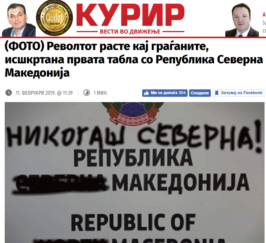 Όπως αναφέρουν ΜΜΕ της χώρας, αναρτώντας σχετική φωτογραφία, μπροστά από το «Северна Македониjа» άγνωστοι έγραψαν μπροστά «никогаш», που δηλαδή «ποτέ».