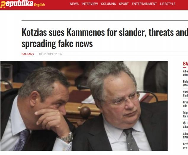 Χαρακτηριστική είναι η αναφορά της εφημερίδας των Σκοπίων Republika, σε ρεπορτάζ με τον τίτλο «Ο Κοτζιάς μηνύει τον Καμμένο για συκοφάντηση, απειλές και διασπορά ψευδών ειδήσεων».