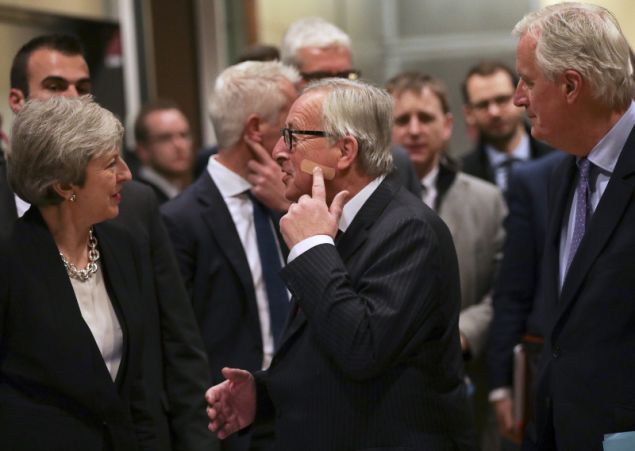 Με ένα τσιρότο στο πρόσωπο εμφανίστηκε ο Ζαν Κλοντ Γιούνκερ, ενώπιον των δημοσιογράφων, πριν από το τετ α τετ του με την Τερέζα Μέι, στις Βρυξέλλες για το Brexit.