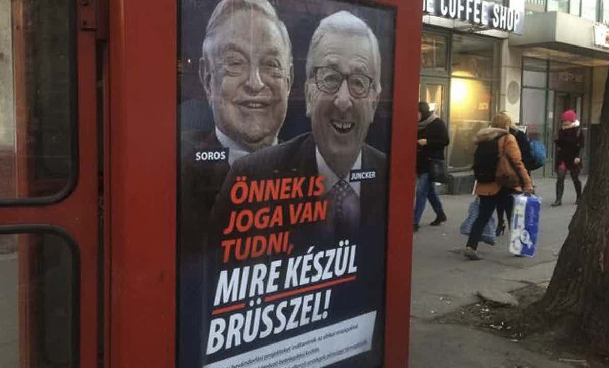 Ο Orbán έχει εξαπούσει μια άνευ προηγουμένου εκστρατεία με πινακίδες που υποστηρίζει ότι ο Πρόεδρος της Ευρωπαϊκής Επιτροπής Juncker και ο Τζορτζ Σόρος είναι «Ενάντια στην Ασφάλεια της Ουγγαρίας».