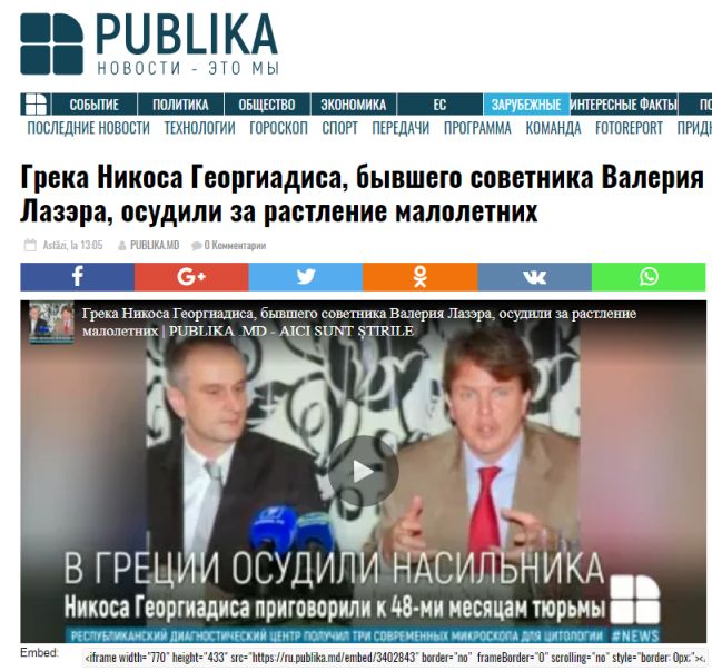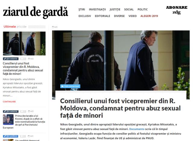 Στα πρωτοσέλιδα του μολδαβικού Τύπου και των τοπικών ιστοσελίδων πρωταγωνιστεί η είδηση της καταδίκης του Νίκου Γεωργιάδη για την συμμετοχή του στο κύκλωμα παιδεραστίας.