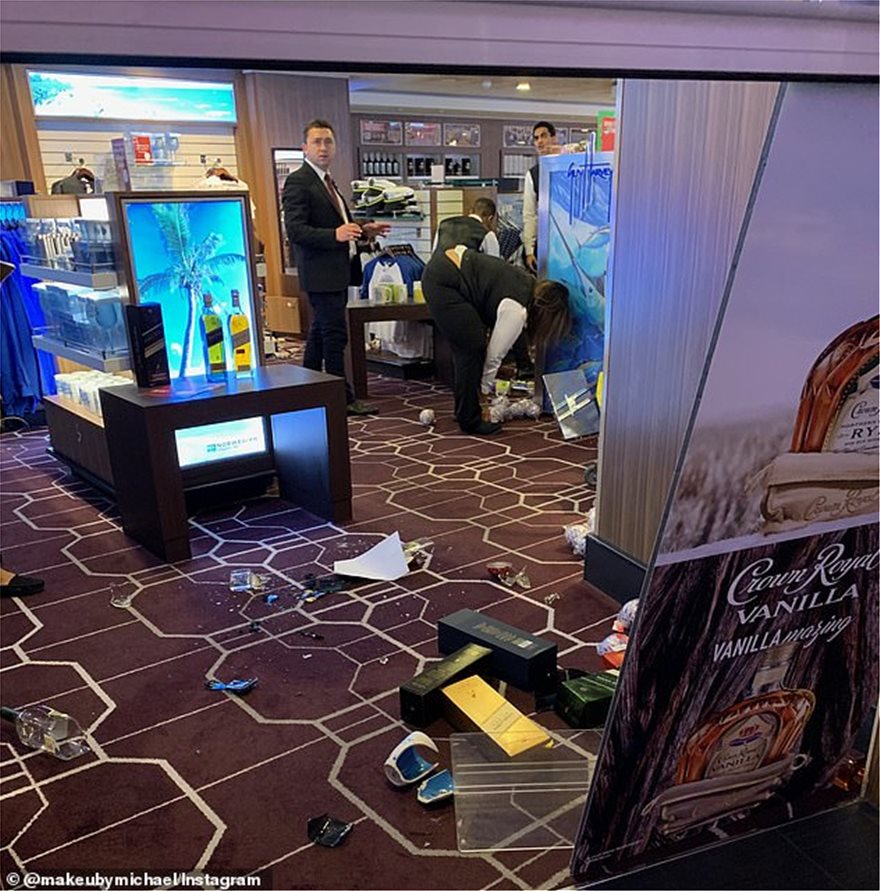 Πολλοί επιβάτες όμως ανέβασαν φωτογραφίες και βίντεο από το εσωτερικό του κρουαζιερόπλοιου στο Instagram, προδίδοντας τι εκτυλίχθηκε μέσα στο πλοίο την ώρα που οι θυελλώδεις άνεμοι το ταρακουνούσαν σαν καρυδότσουφλο.