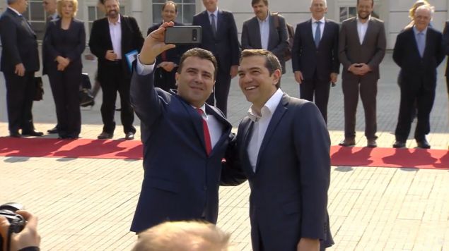 Το κλίμα, κατά την άφιξη στο πρωθυπουργικό μέγαρο, ήταν πανηγυρικό και ο Ζόραν Ζάεφ δεν δίστασε να βγάλει το smartphone του και να τραβήξει selfie με τον Αλέξη Τσίπρα. Η πρώτη selfie είχε φόντο τα δύο υπουργικά συμβούλια και η δεύτερη τους δημοσιογράφους, οι οποίοι αποτύπωναν κάθε στιγμή της συνάντησης.
