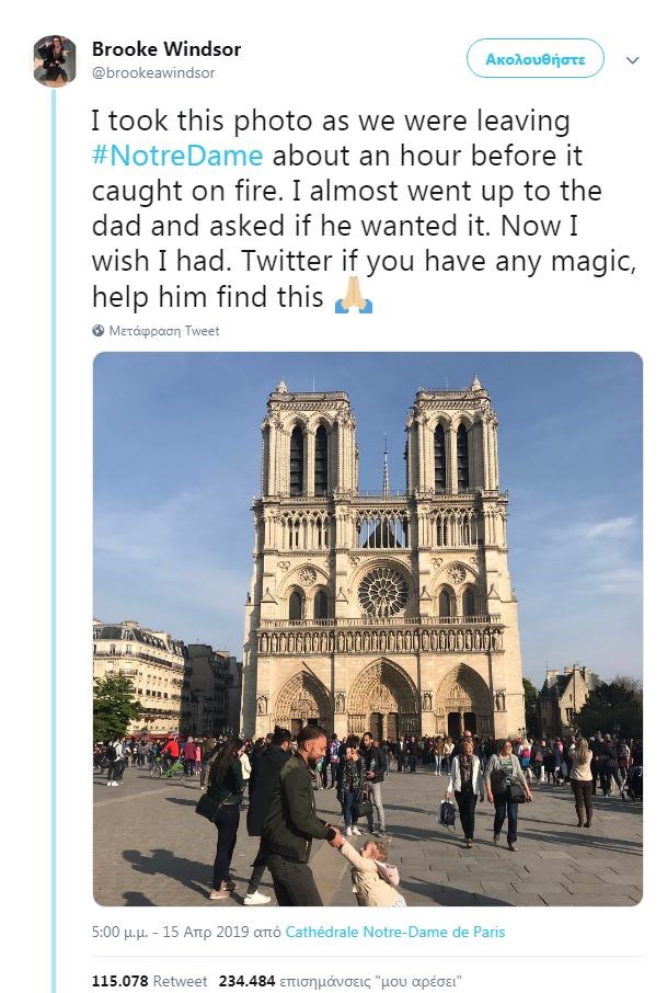 Τη φωτογραφία τράβηξε η Brooke Windsor και η ίδια έγραψε στο twitter «Έβγαλα αυτή τη φωτογραφία την ώρα που φεύγαμε από την Παναγία των Παρισίων, περίπου μια ώρα πριν πιάσει φωτιά. Ήμουν έτοιμη να πάω στον μπαμπά να ρωτήσω εάν την ήθελε. Τώρα εύχομαι να το είχα κάνει. Twitter, αν έχεις μαγικές ικανότητες, σε παρακαλώ βοήθησέ τον να τη βρει».