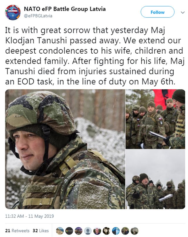 Τη Δευτέρα 6 Μαΐου μία Αλβανίδα αξιωματικός σκοτώθηκε και δύο ακόμα Αλβανοί στρατιωτικοί τραυματίστηκαν, ενώ συμμετείχαν σε επιχείριση εξουδετέρωσης ναρκών του Β’ Παγκοσμίου Πολέμου στη Λετονία.