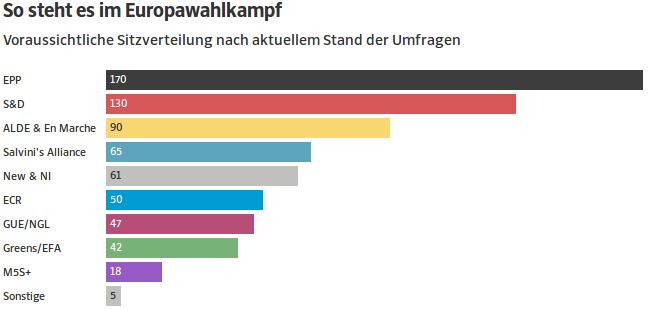 Όπως επισημαίνει η εφημερίδα του Μονάχου, σύμφωνα με τις μέχρι τώρα δημοσκοπήσεις, το Ευρωπαϊκό Λαϊκό Κόμμα (ΕΛΚ) θα συγκεντρώσει τις περισσότερες έδρες στο νέο Ευρωπαϊκό Κοινοβούλιο με δεύτερη δύναμη το Ευρωπαϊκό Σοσιαλιστικό Κόμμα. Ωστόσο καμία από τις δύο βασικές πολιτικές ομάδες δεν προβλέπεται να καταφέρει να κερδίσει την πλειοψηφία των εδρών, καθώς ακόμη δεν είναι απολύτως ξεκάθαρο ποια κόμματα θα σχηματίσουν κοινές πολιτικές ομάδες μετά τις ευρωεκλογές, κάτι που ενδέχεται να επηρεάσει τον αριθμό των εδρών τους.