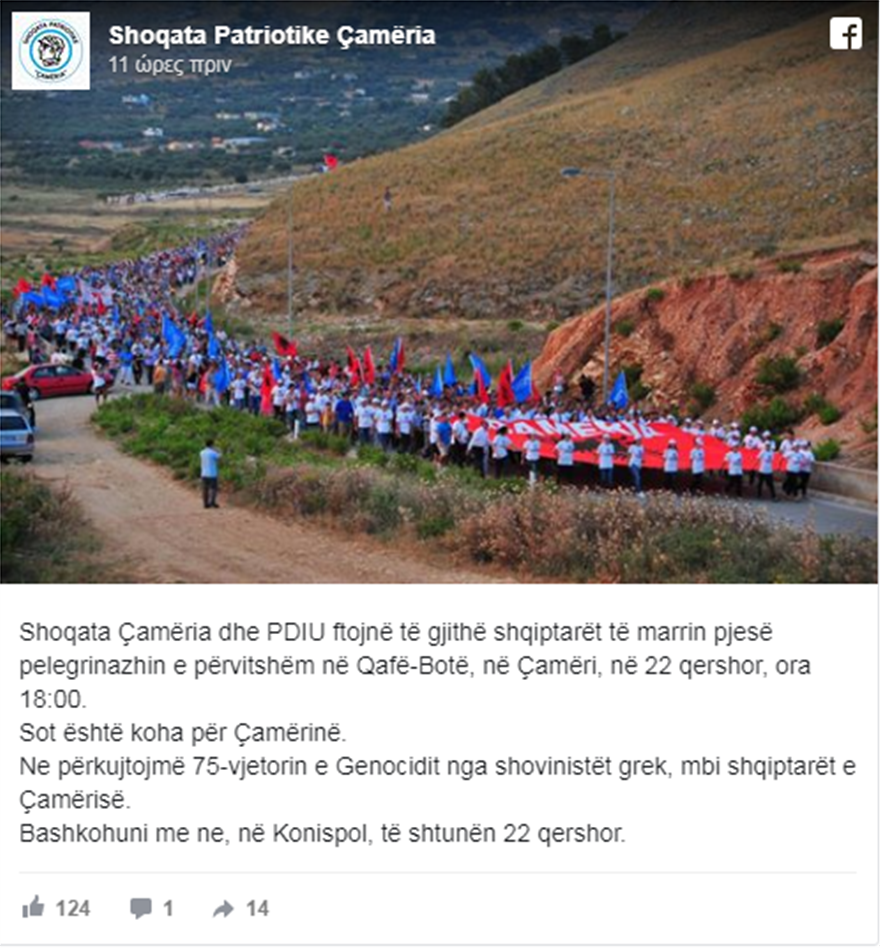 «Ο σύνδεσμος Τσαμουριά και το Κόμμα για Δικαιοσύνη, Ενσωμάτωση και Ενότητα-PDIU, καλούν όλους τους Αλβανούς να συμμετάσχουν στο ετήσιο προσκύνημα στο Κιαφέ Μπότε στην τσαμουριά στις 22 Ιουνίου και ώρα 18:00.