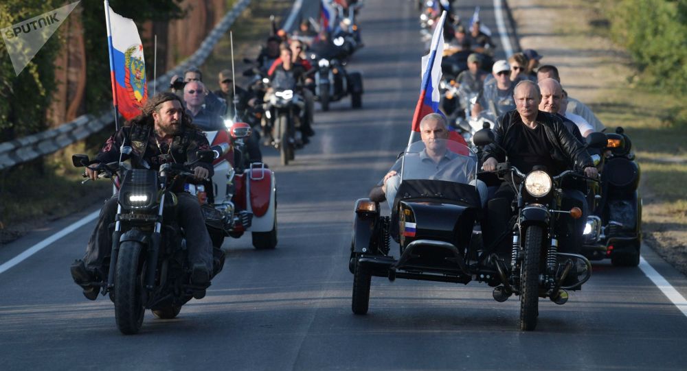 Οδηγώντας μοτοσυκλέτα Ural έφτασε στη διεθνή έκθεση μοτοσυκλέτας «Shadow of Babylon» που διοργάνωσε το «Night Wolves» στην Κριμαία, ο Ρώσος πρόεδρος Βλαντιμίρ Πούτιν.