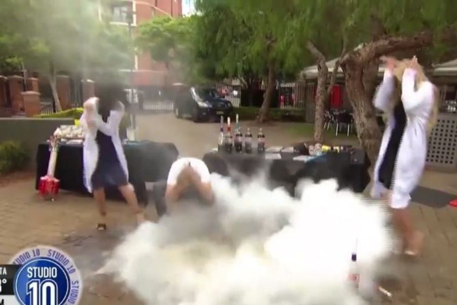 Ο καθηγητής-YouTuber Jacob Strickling επισκέφτηκε την εκπομπή “Studio 10” για να κάνει ένα πείραμα με υγρό άζωτο και μπουκάλια από κόλα με σκοπό να τα μετατρέψει σε μικροσκοπικές ρουκέτες.