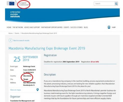 Με νωπή ακόμη την Συμφωνία των Πρεσπών και την αλλαγή της ονομασίας της χώρας είναι προφανές τι θα συμβαίνει σε λίγα χρόνια, όταν ακόμη και τώρα η ίδια η Κομισιόν συγχέεται και παρουσιάζει σε έγγραφο της την χώρα ως «Μακεδονία». Η “Macedonia Manufacturing EXPO 2019” διοργανώνεται από την ΜΑΜΕΙ («Macedonian Association of Metal and Electrical Industry» ,την Αντιπροσωπεία της Γερμανίας στην Βόρεια Μακεδονία, και υποστηρίζεται από την αμερικανική υπηρεσία αναπτυξιακής βοήθειας USAID, το Γερμανικό Υπουργείο Οικονομικών και Ενέργειας και τον επίσημο οργανισμό (που συνεχίζει να αναφέρεται σε «Μακεδονία») «Invest Macedonia».
