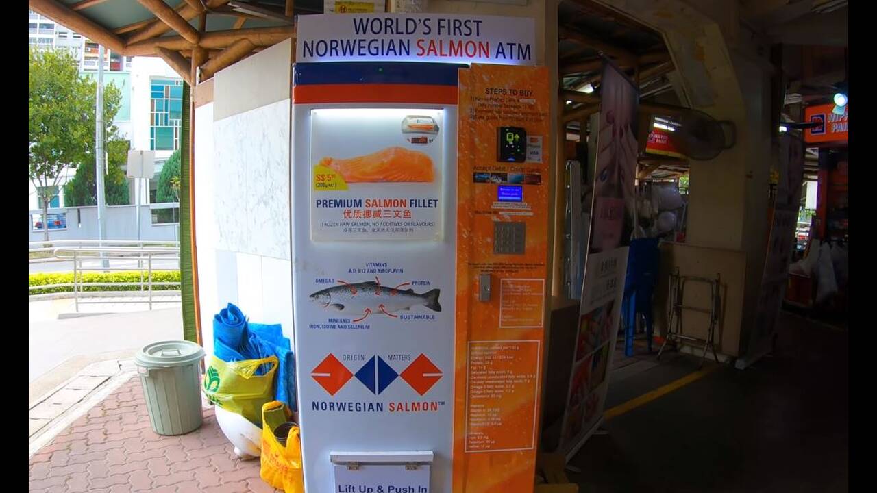 Τον περασμένο Ιανουάριο, στο εμπορικό κέντρο Wisteria στη Σιγκαπούρη εμφανίστηκε ένα καινούριου τύπου ATM: στο οποίο μπορείτε να κάνετε ανάληψη όχι χρημάτων, αλλά… φιλέτων κατεψυγμένου σολομού από τα νορβηγικά φιορδ, βάρους 200 γραμμαρίων το καθένα.
