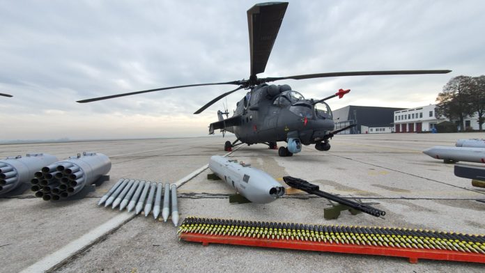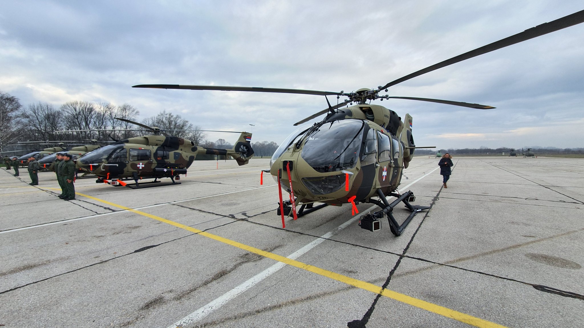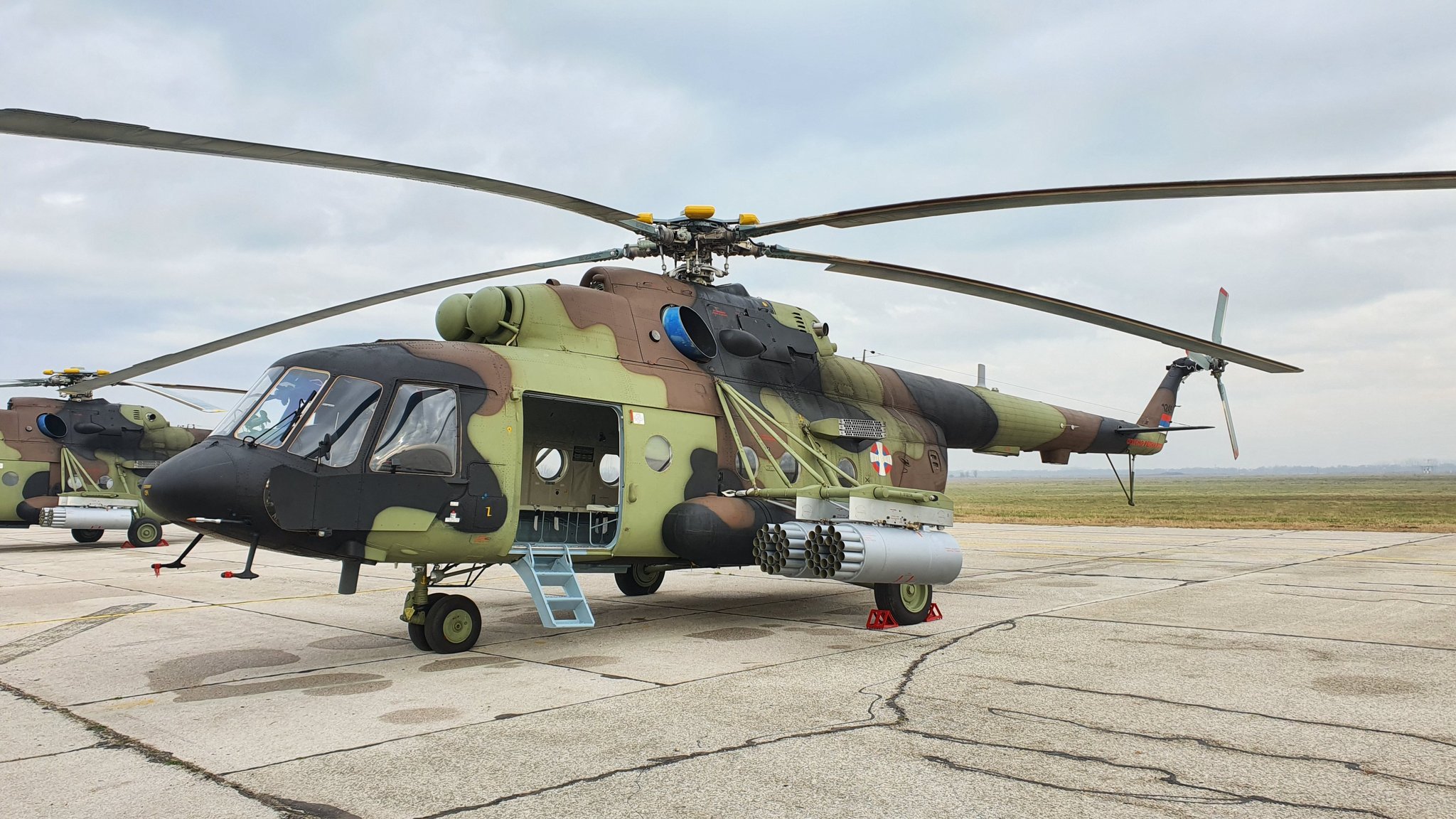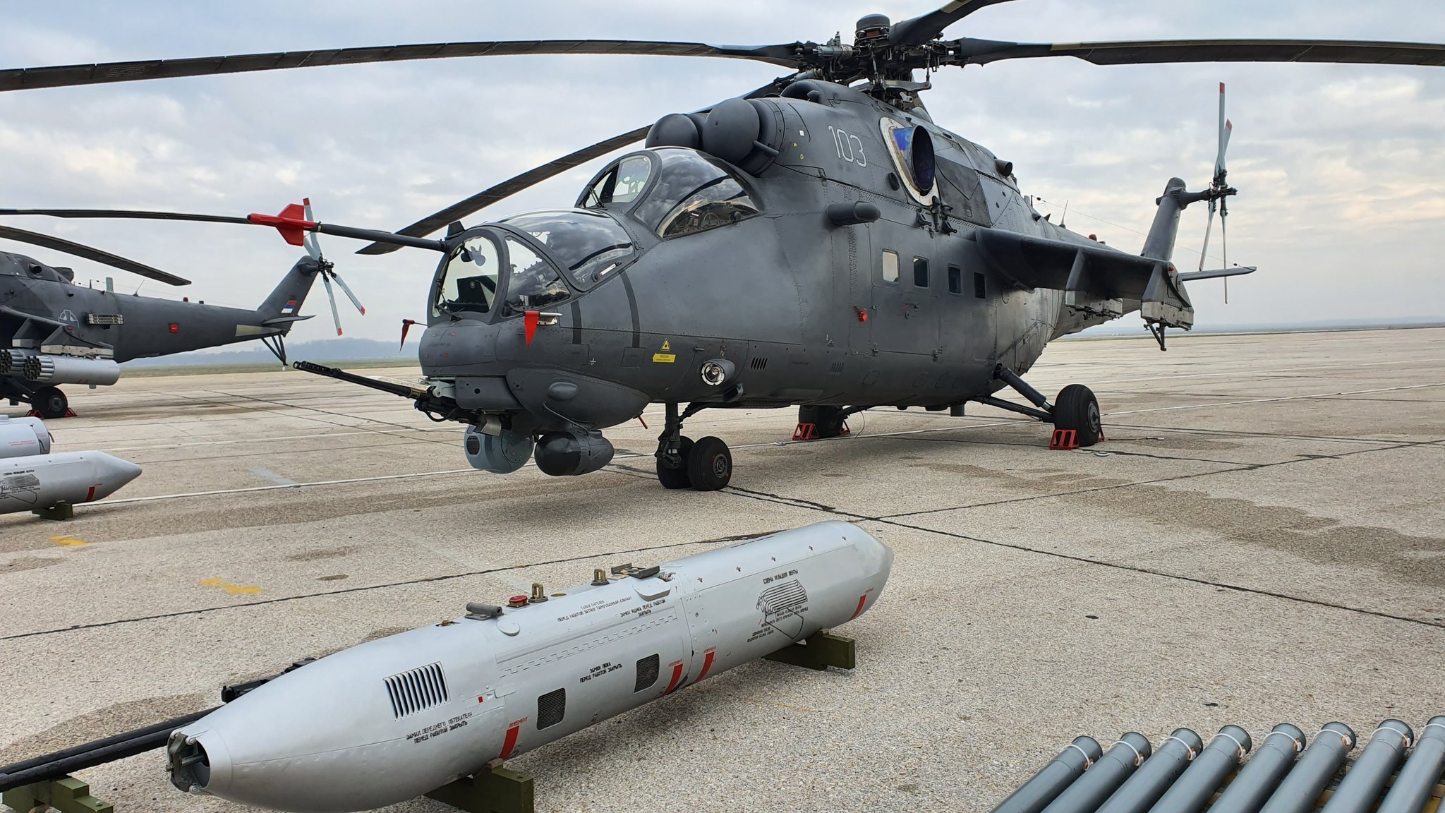 Τα νέα ρωσικά επιθετικά και μεταφορικά της ελικόπτερα που παρέλαβε η Σερβία από την Ρωσία επέδειξε σε αεροπορική της βάση.