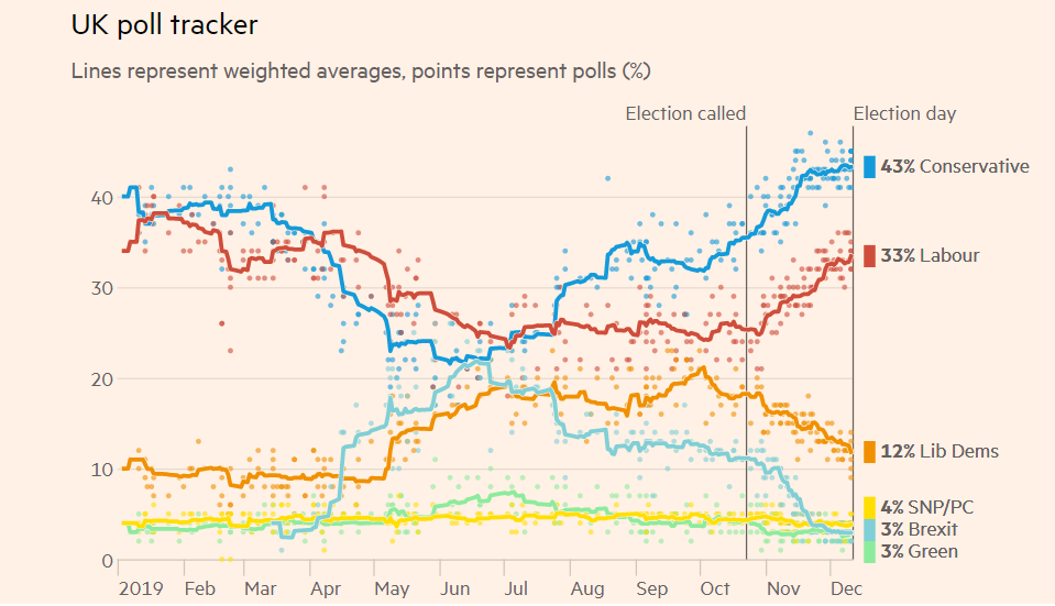 Μάλιστα, ταυτίζονται με το συνδυαστικό poll των Financial Times το οποίο περιλαμβάνει όλες τις δημοσκοπήσεις που έχουν γίνει μέχρι στιγμής σύμφωνα με το οποίο, ο Μπόρις Τζόνσον αναμένεται να κερδίσει με 10 μονάδες (43% έναντι 33%).