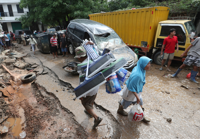 Όσοι γύρισαν, βρέθηκαν αντιμέτωποι μ’ ένα αποκαρδιωτικό θέαμα: δρόμοι σκεπασμένοι από λάσπες και φερτές ύλες, αυτοκίνητα που παρασύρθηκαν από τα νερά στοιβαγμένα σε στενοσόκακα, πεζοδρόμια γεμάτα γλάστρες, οικιακά σκεύη, παντόφλες, παλιές φωτογραφίες… Οι Αρχές της Ινδονησίας επωφελήθηκαν από την υποχώρηση των υδάτων για να καθαρίσουν τις λάσπες, ενώ αποκαταστάθηκε η ηλεκτροδότηση σε χιλιάδες νοικοκυριά και επιχειρήσεις. Το αεροδρόμιο της Τζακάρτα, που είχε κλείσει λόγω των πλημμυρών, ξανάνοιξε.