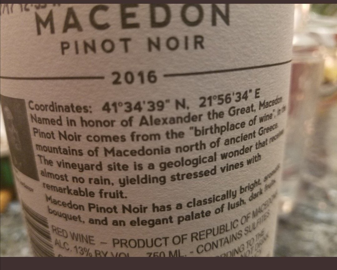Ένα Σκοπιανό κρασί το οποίο φέρει την ονομασία «Macedon Pinot Noir» και κυκλοφορεί ακόμα στο εμπόριο, αναφέρει τα εξής στην πίσω πλευρά του.