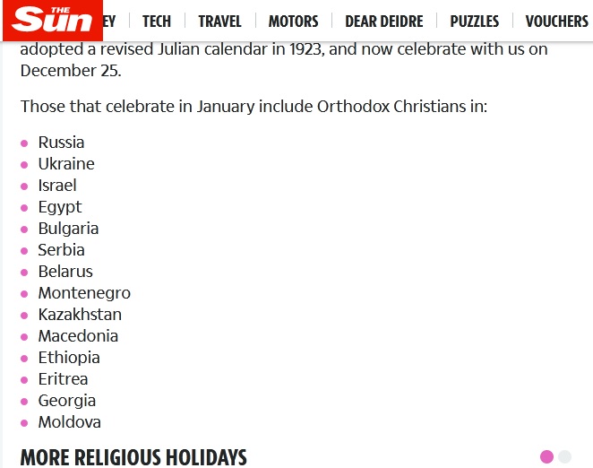 «Η βρετανική εφημερίδα «The Sun» σε άρθρο της με τίτλο «Γιατί οι Ορθόδοξοι Χριστιανοί γιορτάζουν τα Χριστούγεννα στις 7 Ιανουαρίου;», συμπεριλαμβάνει τη χώρα μας την οποία αποκαλεί χωρίς το ‘Βόρεια’, δηλαδή, σκέτο ‘Μακεδονία’, γράφει το δημοσίευμα.