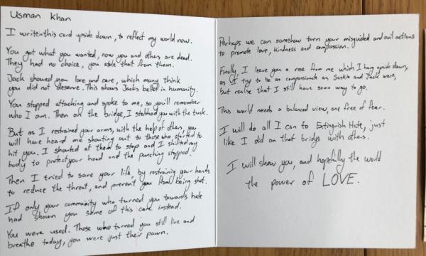 Λίγες μέρες μετά τη φονική επίθεση στη Γέφυρα του Λονδίνου, όπου έχασαν τη ζωή τους δύο άνθρωποι, ο Ντάριν Φρόστ, ο άνδρας που αντιμετώπισε τον 28χρονο Ουσμάν Καν με έναν… χαυλιόδοντα, έγραψε ένα συγκινητικό γράμμα για να το αφήσει στο σημείο της τραγωδίας.