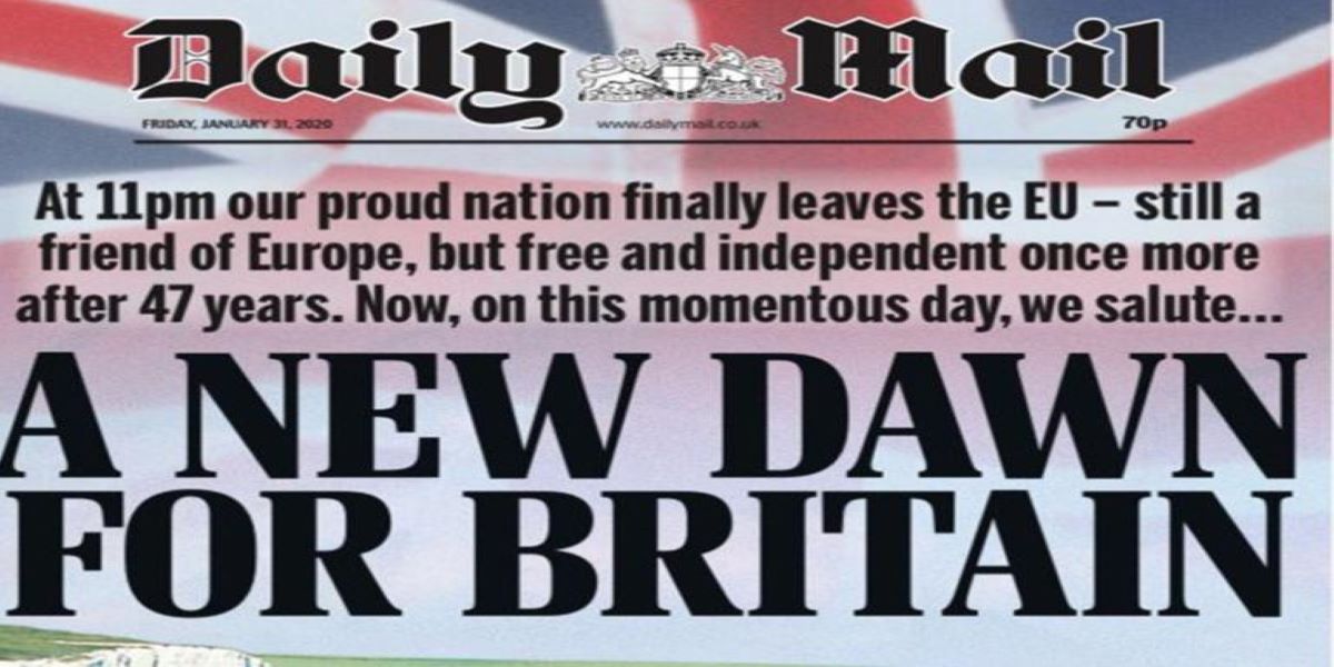 «Νέα αυγή για τη Μεγάλη Βρετανία», είναι ο τίτλος της Daily Mail, μιας άλλης εφημερίδας που είναι υπέρ του Brexit. «Στις 11 το βράδυ το περήφανο έθνος μας θα αποχωρήσει επιτέλους από την ΕΕ—πάντα φίλη με την Ευρώπη, αλλά ελεύθερη και ξανά ανεξάρτητη έπειτα από 47 χρόνια».