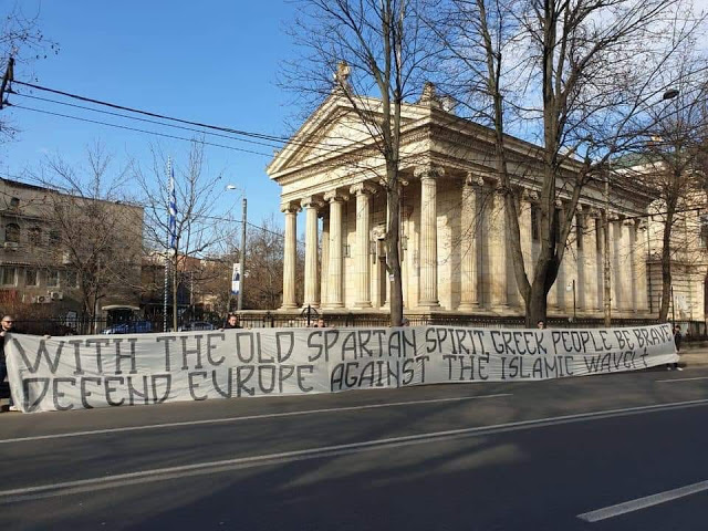 ”Με το αρχαίο σου Σπαρτιατικό πνεύμα, γενναίε Ελληνικέ λαέ, αμύνσου για την Ευρώπη ενάντια στο Ισλαμικό κύμα’‘.