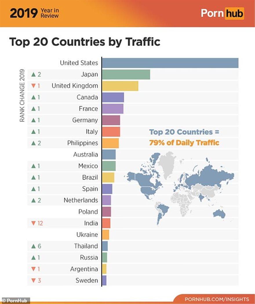 Η Ιταλία βρισκόταν στην 7η θέση στη λίστα του Pornhub με τις 20 χώρες με την μεγαλύτερη κίνηση για το 2019, με τις ΗΠΑ, την Ιαπωνία και το Ηνωμένο Βασίλειο να καταλαμβάνουν τις τρεις πρώτες θέσεις.