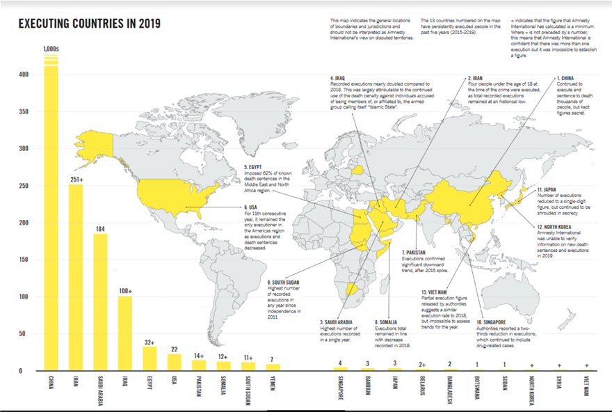Η Διεθνής Αμνηστία λαμβάνοντας ως δεδομένο ότι η Κίνα βρίσκεται στην κορυφή της λίστας με τις περισσότερες εκτελέσεις, χωρίς όμως να είναι σε θέση να προσδιορίσει τον ακριβή αριθμό τους, διαπιστώνει ότι στις υπόλοιπες χώρες όπου εφαρμόζεται η θανατική ποινή κατά το 2019 εκτελέστηκαν: 251 άνθρωποι στο Ιράν, 184 στη Σαουδική Αραβία, 100 στο Ιράκ, 32 στην Αίγυπτο, 22 στις ΗΠΑ, 14 στο Πακιστάν, 12 στη Σομαλία, 11 στο Νότιο Σουδάν, 7 στην Υεμένη, 4 στη Σιγκαπούρη, 3 στο Μπαχρέιν και στην Ιαπωνία, 2 στη Λευκορωσία και το Μπαγκλαντές, 1 στην Μποτσουάνα και στο Σουδάν ενώ στοιχεία δεν υπάρχουν για τη Βόρεια Κορέα, τη Συρία και το Βιετνάμ καθώς συνεχίζουν να αποκρύβουν το πραγματικό μέγεθος της επιβολής θανατικής ποινής στην επικράτεια τους.