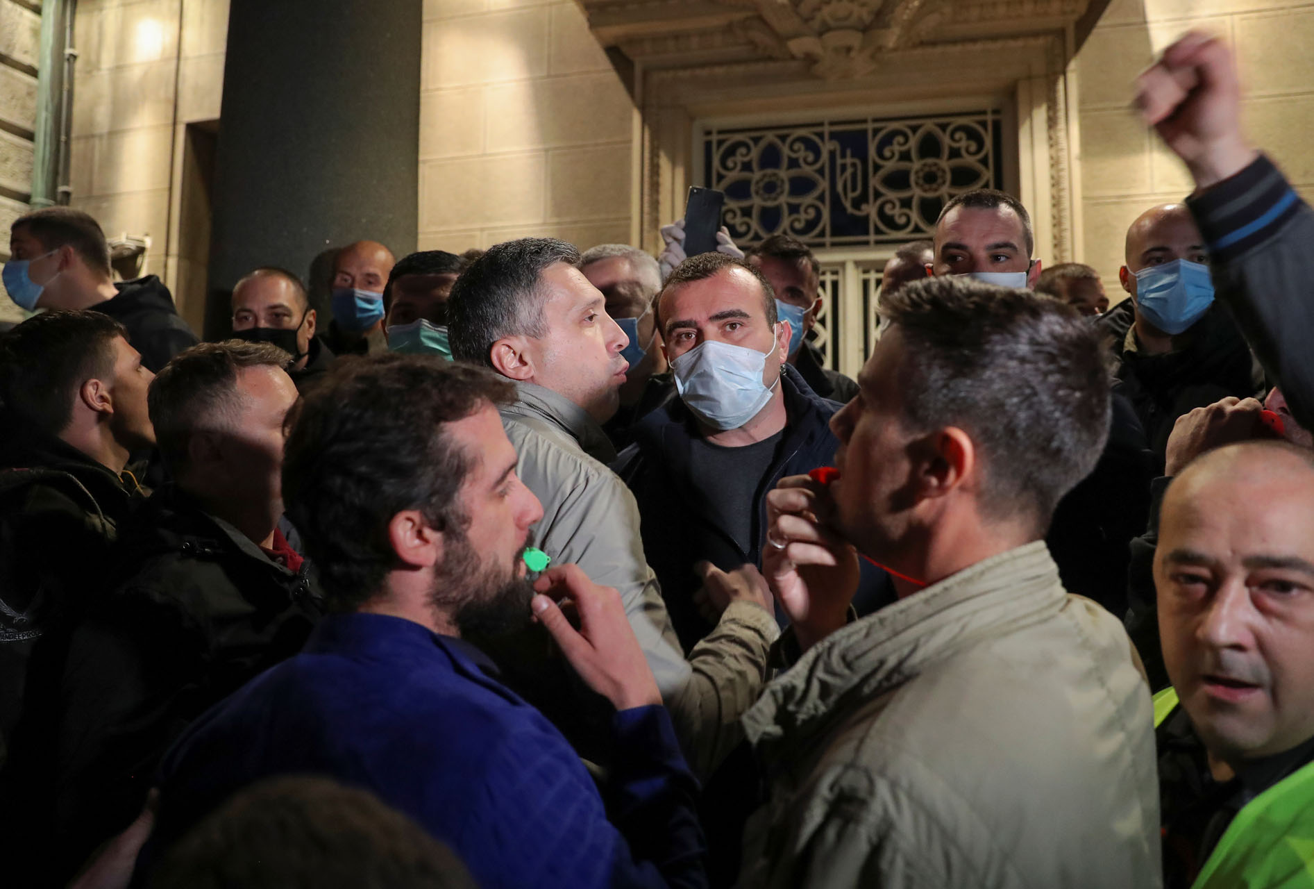 Μέλη του κινήματος «Dveri» εμπόδιζαν βουλευτές του κυβερνητικού συνασπισμού να μπουν στο κτίριο της βουλής, με αποτέλεσμα να δημιουργεί μεγάλη ένταση μεταξύ διαδηλωτών και βουλευτών..