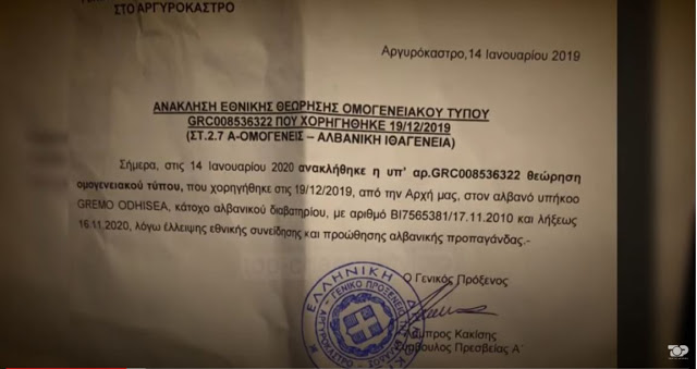 Το αλβανικό ντοκυμαντέρ παρουσιάζει ομιλίες με κρυφή κάμερα στο προξενείο του Αργυρόκαστρου με έναν Αλβανό κάτοικο ονόματι Gremo Odhisea του οποίου ανακλήθηκε η ‘θεώρηση ομογενειακού τύπου’ που του είχε χορηγηθεί λόγω προώθησης αλβανικής προπαγάνδας στα ελληνικά χωριά της περιοχής Αργυρόκαστρου.