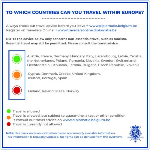Η Ελλάδα μαζί με την Κύπρο, τη Δανία, το Ηνωμένο Βασίλειο, την Ισλανδία, την Πορτογαλία και την Ισπανία, συγκαταλέγονται στις «πορτοκαλί» χώρες, που σημαίνει ότι όσοι επιστρέφουν στο Βέλγιο από αυτές, θα τους ζητείται να υποβάλλονται σε τεστ και θα μπαίνουν σε καραντίνα.