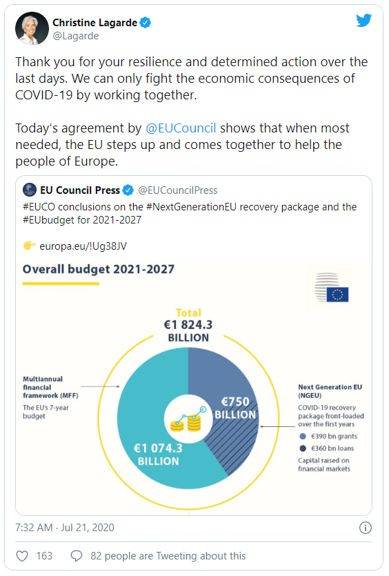 Συγκεκριμένα η κυρία Λαγκάρντ στον της λογαριασμό στο twitter αναφέρει: «Σας ευχαριστούμε για την ανθεκτικότητα και την αποφασιστική σας δράση τις τελευταίες ημέρες. Μπορούμε να καταπολεμήσουμε τις οικονομικές συνέπειες του covid-19 μόνο ενωμένοι. Η σημερινή συμφωνία από Ευρωπαϊκό Συμβούλιο δείχνει ότι όταν χρειάζεται η ΕΕ έρχεται για να βοηθήσει τους λαούς της Ευρώπης».