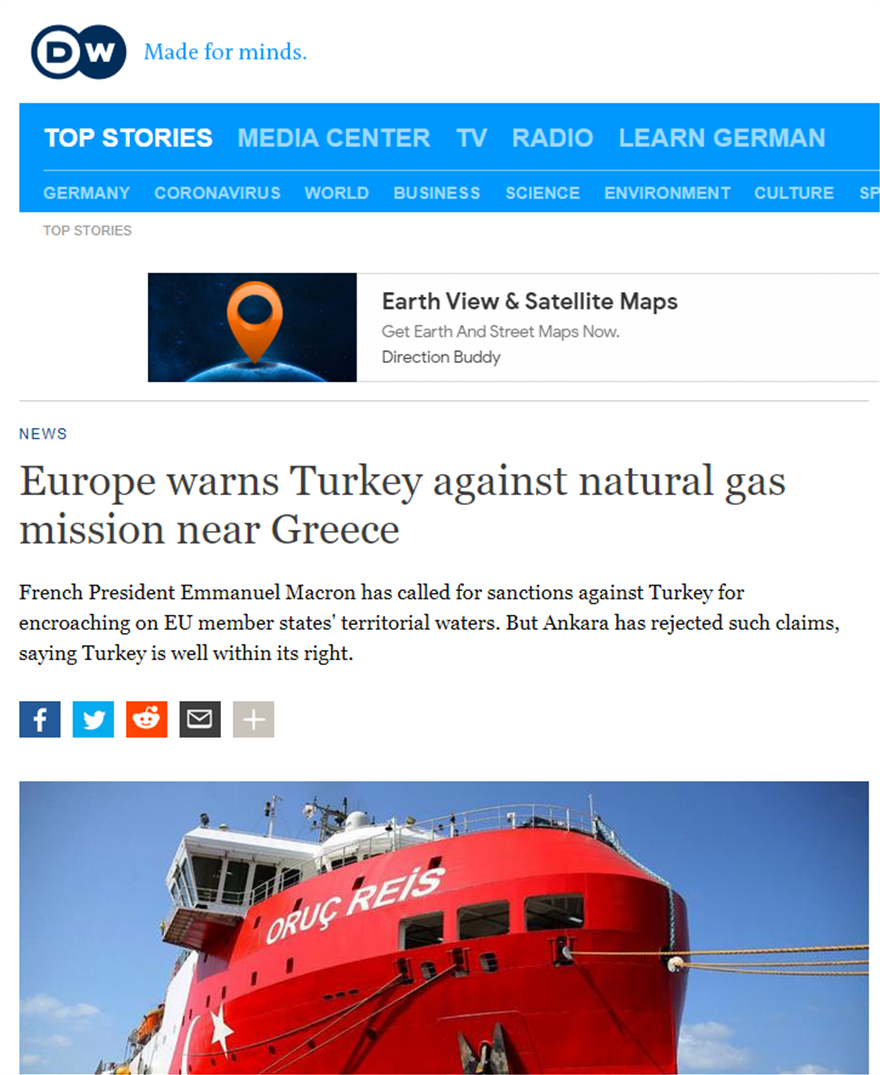 «Ο Γάλλος πρόεδρος Εμανουέλ Μακρόν ζήτησε κυρώσεις εναντίον της Τουρκίας για παραβίαση των χωρικών υδάτων της Κύπρου και της Ελλάδας, δύο κρατών – μελών της ΕΕ. Ωστόσο, η Άγκυρα απέρριψε τέτοιους ισχυρισμούς, αναφέροντας ότι η Τουρκία έχει τα δικά της κυριαρχικά δικαιώματα. Ευρωπαίοι αξιωματούχοι προειδοποίησαν χθες την Τουρκία να μην συνεχίσει τις έρευνες για την εκμετάλλευση κοιτασμάτων φυσικού αερίου κοντά σε ελληνικά νησιά στην ανατολική Μεσόγειο».