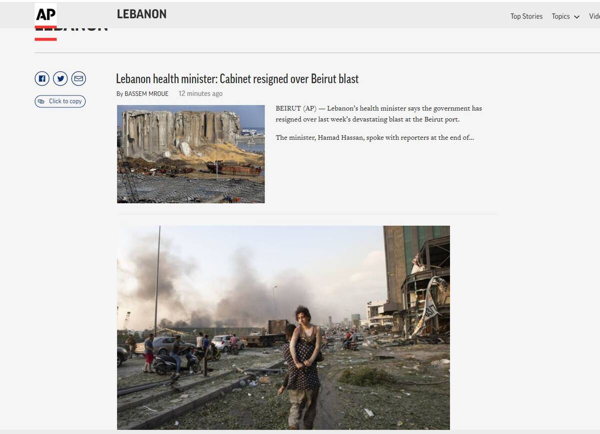 Σύμφωνα με το Associated Press, ο υπουργός Υγείας του Λιβάνου, Χαμάντ Χασάν, δήλωσε ότι η κυβέρνηση παραιτήθηκε στον απόηχο της τραγωδίας που σημειώθηκε στη Βηρυτό, την περασμένη εβδομάδα.