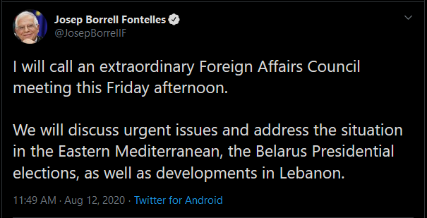 ¨Θα καλέσω μια έκτακτη συνεδρίαση του Συμβουλίου Εξωτερικών Υποθέσεων την Παρασκευή το απόγευμα. Θα συζητήσουμε επείγοντα θέματα και θα εξετάσουμε την κατάσταση στην Ανατολική Μεσόγειο, τις προεδρικές εκλογές της Λευκορωσίας, καθώς και τις εξελίξεις στον Λίβανο.¨