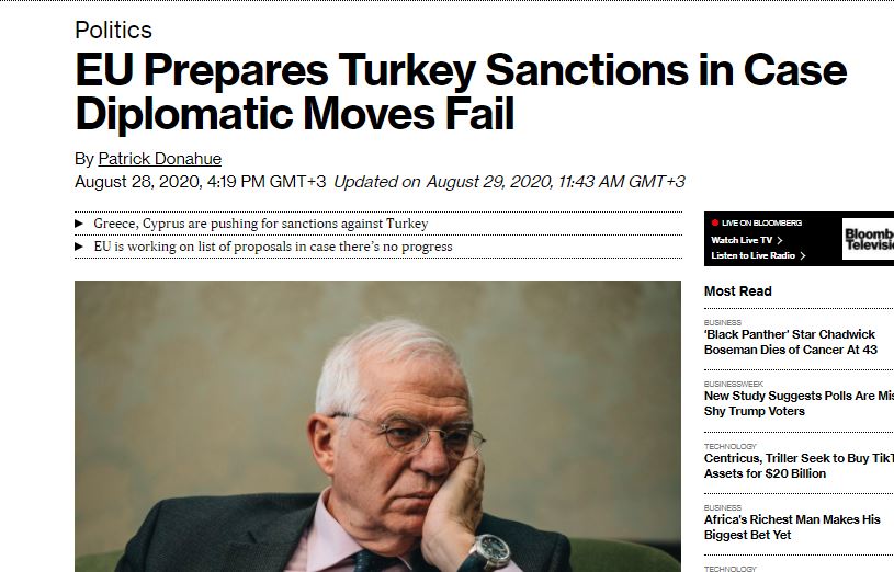 Σημερινό δημοσίευμα του Bloomberg αναφέρει ότι η Ευρωπαϊκή Ένωση ετοιμάζει κυρώσεις εναντίον της Τουρκίας για τις εντάσεις που δημιουργεί στην Ανατολική Μεσόγειο, σε περίπτωση που αποτύχει η διπλωματική οδός.