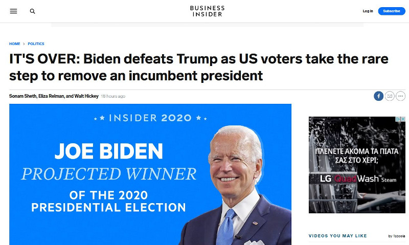 «ΤΕΛΕΙΩΣΕ:Ο Μπάιντεν νικά τον Τραμπ καθώς οι Αμερικανοί ψηφοφόροι κάνουν το σπάνιο βήμα να αποπέμψουν έναν Πρόεδρο που διεκδικεί την επανεκλογή του», αναφωνεί το Business Insider.