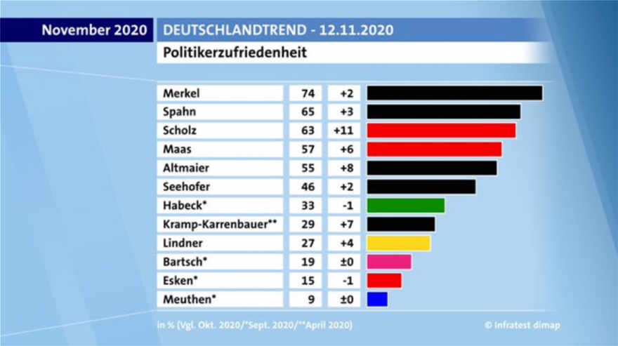 Μια θέση στους δημοφιλέστερους πολιτικούς της Γερμανίας κατάφερε να κερδίσει και πάλι η καγκελάριος Άνγκελα Μέρκελ, της οποίας η διαχείριση της κρίσης του κορωνοϊού φαίνεται να κερδίζει την αποδοχή των πολιτών.