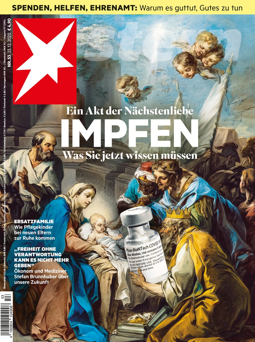 Το γερμανικό περιοδικό Stern κυκλοφόρησε με ένα εξώφυλλο που έχει δημιουργήσει μεγάλες αντιδράσεις. Σε αυτό εικονίζεται η σκηνή από την φάτνη του Ιησού με ένα από τους τρείς μάγους να κρατά στα χέρια του μια τεράστια δόση από το εμβόλιο του κορωνοϊού της Pfizer, όπως αναγράφεται επάνω στη δόση!