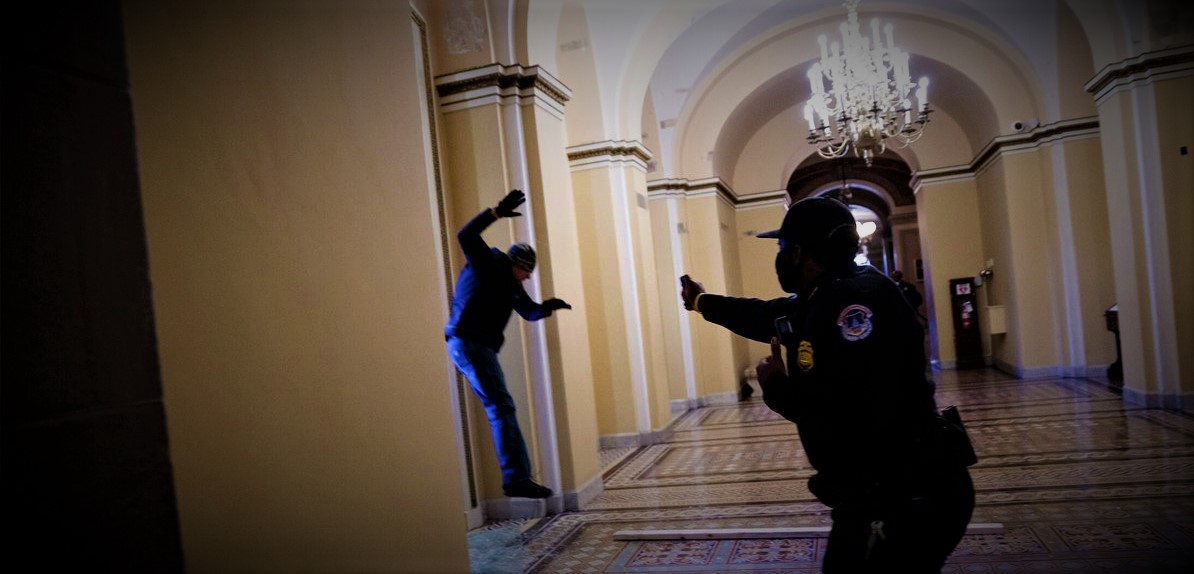 Δείτε συγκλονιστική φωτό με Αμερικανό πατριώτη να πηδά μέσα στο Καπιτώλιο και αστυνομικό της φρουράς να προσπαθεί να τον αναχαιτίσει με χημικό σπρέι: