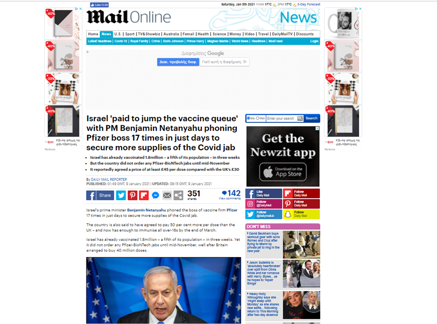 Σύμφωνα με εκτενές ρεπορτάζ της «Daily Mail» ο ισραηλινός πρωθυπουργός προσφέρει «Γη και ύδωρ», προκειμένου να προπορευτεί και να παραλάβει νέες δόσεις εμβολίων για τη χώρα.