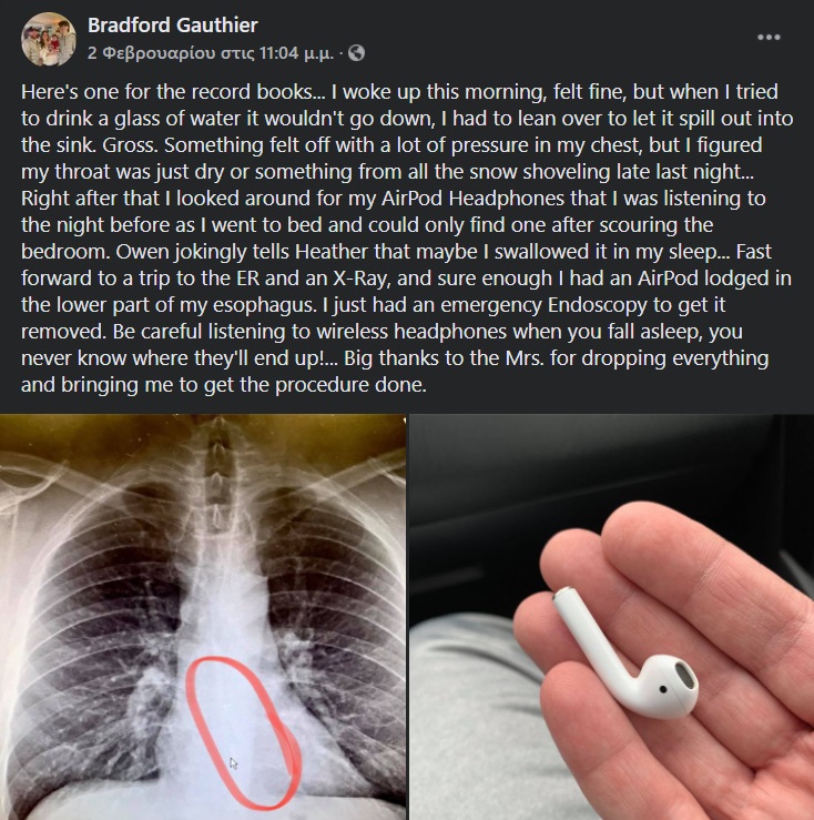 Όσο περίεργο και αν ακούγεται είναι πέρα για πέρα αληθινό, καθώς ο Μπράντφορντ Γκοτιέρ ένιωθε δυσφορία όταν κατάπινε και ανακάλυψε ότι αυτό προκλήθηκε από ένα AirPod που είχε καταπιεί.