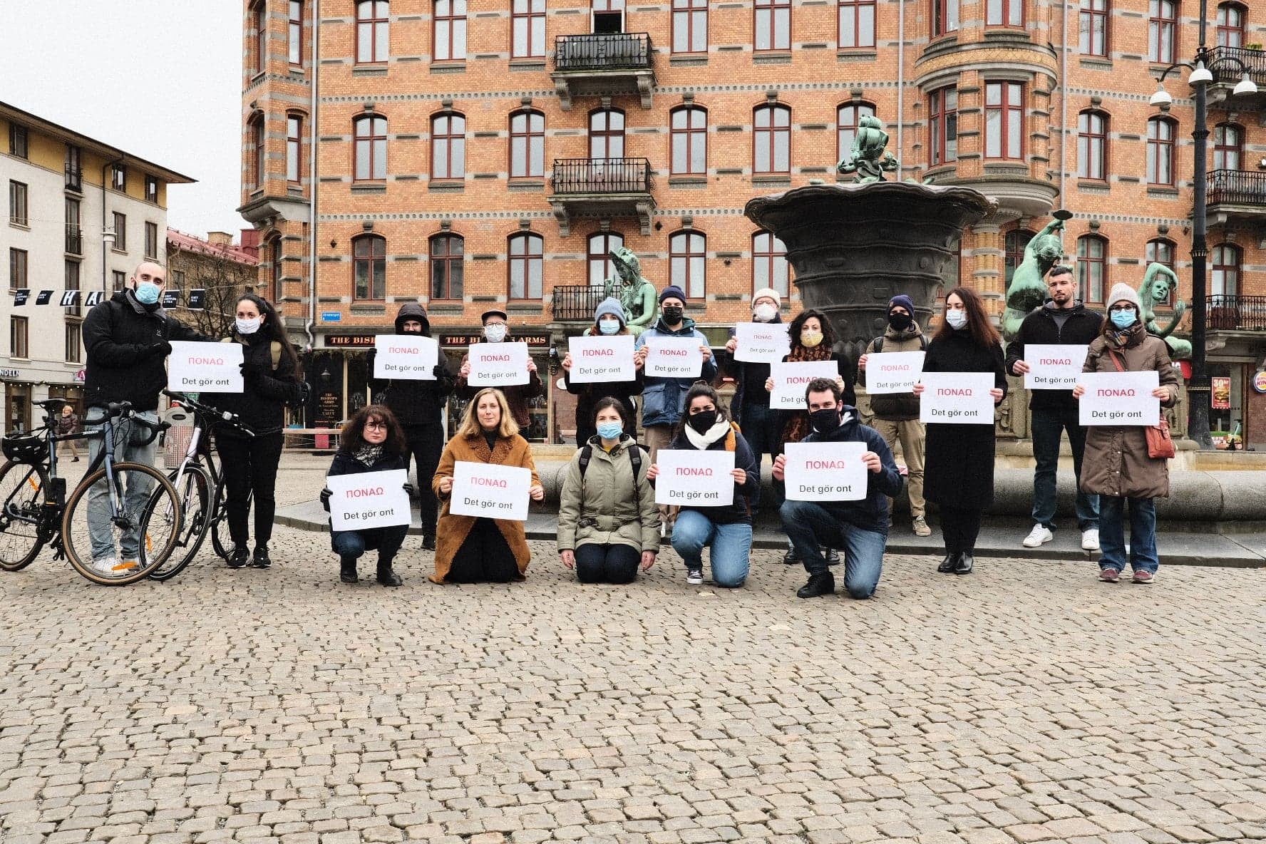 Μια ομάδα ανθρώπων που ζει στο Γκέτεμποργκ κρατώντας χαρτιά που γράφουν «πονάω», παραπέμποντας σε όσα έγιναν πριν λίγες βδομάδες μέρα μεσημέρι στη Νέα Σμύρνη όπου η αστυνομία επιτέθηκε σε πολίτες, διαμαρτυρήθηκαν για την αστυνομοκρατία.