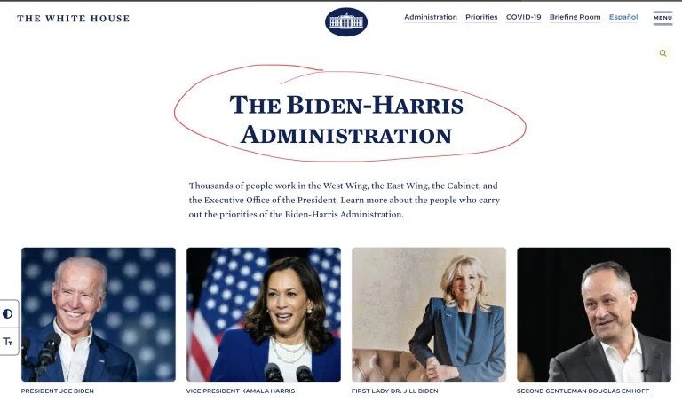 Αντί να αναφέρει την νέα κυβέρνηση ως «Διοίκηση Μπάιντεν» στην επίσημη σελίδα της, ο Λευκός Οίκος την αναφέρει ως «Διοίκηση Μπάιντεν-Χάρις», βάζοντας την Καμάλα Χάρις σε σχεδόν ίσο επίπεδο με τον ίδιο τον πρόεδρο.