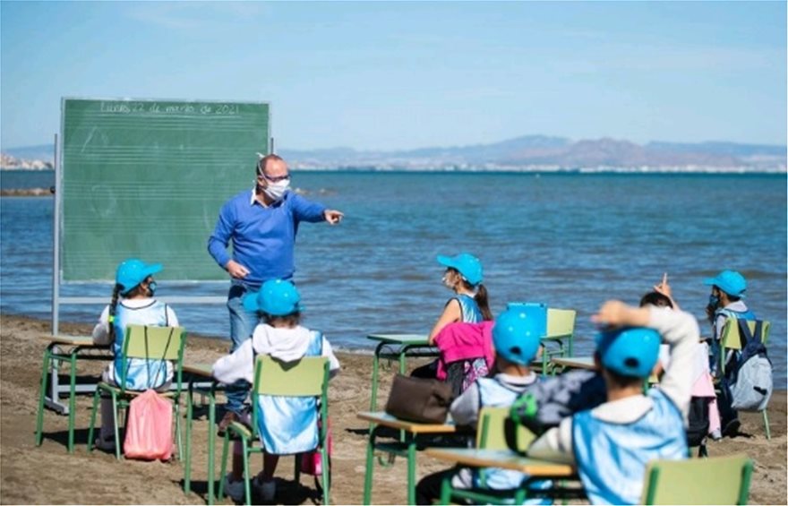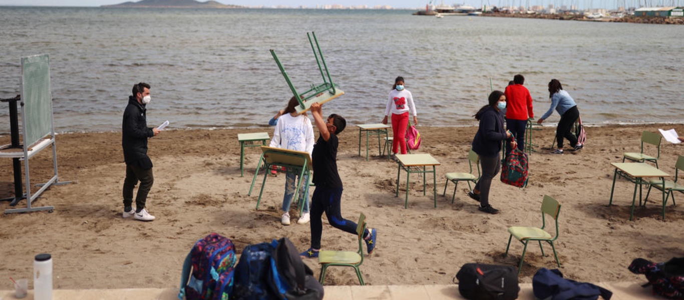 Έξω από το σχολείο Felix Rodriguez de la Fuente, μαθητές φορώντας τις προστατευτικές τους μάσκες κάθονται μπροστά σε έναν φορητό μαυροπίνακα σε σειρές πράσινων θρανίων τοποθετημένων με τις απαραίτητες μεταξύ τους αποστάσεις πάνω στις αμμουδιές της Playa de los Nietos (Η Παραλία των Εγγονιών).