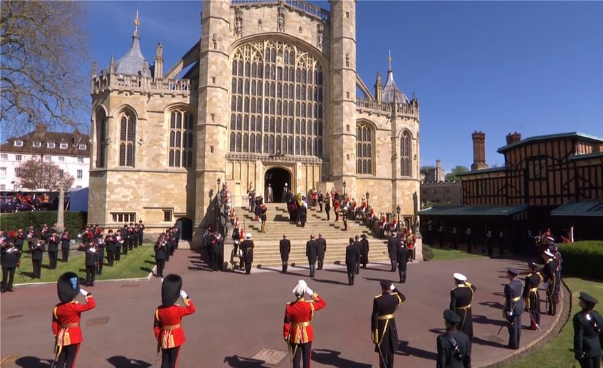 Με δάκρυα στα μάτια και το κεφάλι σκυμμένο ως ένδειξη σεβασμού η βασίλισσα Ελισάβετ καθώς συνόδευε το φέρετρο του συζύγου της, πρίγκιπα Φίλιππου, στο τελευταίο του ταξίδι από το κάστρο Γουίνδσορ στο παρεκκλήσι του Αγίου Γεωργίου για την κηδεία του δούκα του Εδιμβούργου.