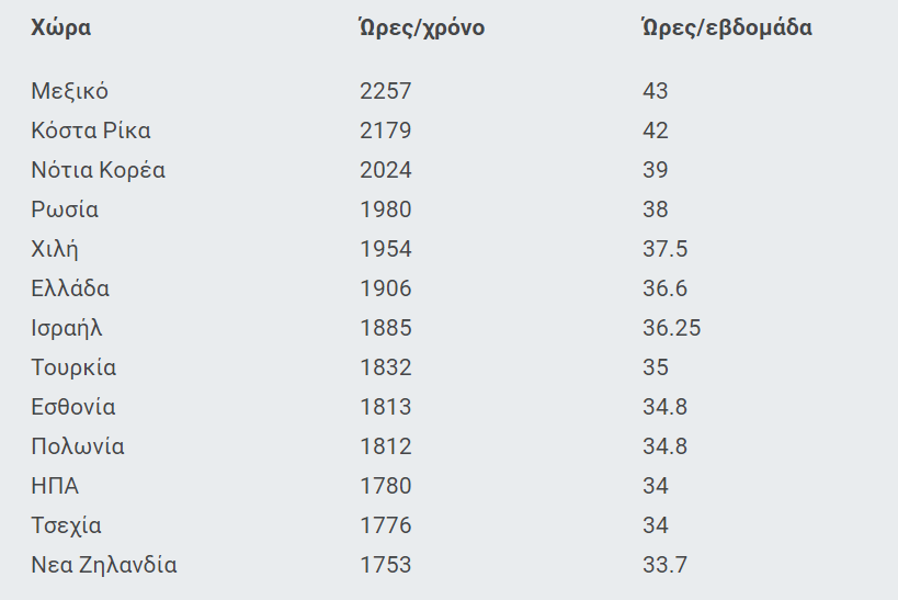 Σύμφωνα λοιπόν με την έρευνα, στο Μεξικό οι εργαζόμενοι σπαταλούν 2.257 ώρες τον χρόνο δουλεύοντας, δηλαδή 43 ώρες την εβδομάδα. Δεύτερη είναι η Κόστα Ρίκα με μια ώρα λιγότερη ανά εβδομάδα και τρίτη η Νότια Κορέα, με 39 ώρες την εβδομάδα. Η Ελλάδα βρίσκεται στην 6η θέση με τις περισσότερες ώρες ανά εβδομάδα, οι οποίες φτάνουν τις 36,6.
