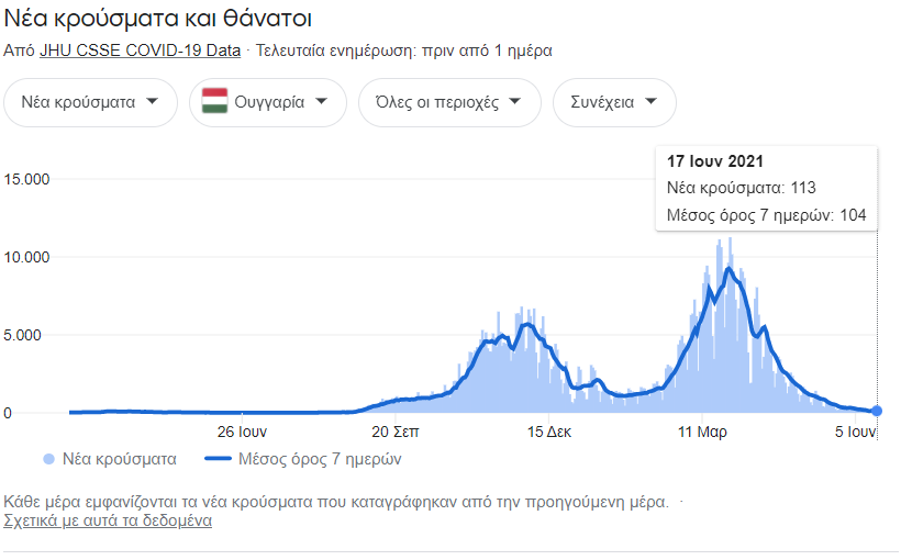 Όλα τα παραπάνω οδήγησαν την Ουγγαρία στο να έχει εμβολιάσει μέχρι σήμερα το 44% με δύο δόσεις, ενώ η Ελλάδα περίπου το 33%. Παράλληλα παρατηρούμε πως στην Ουγγαρία έχει εμβολιαστεί το μεγαλύτερο μέρος του πληθυσμού που θεωρείται ευάλωτο. 73,5% των άνω 80 ετών (στην Ελλάδα 68,2%), 84,6% των 70-79 ετών (στην Ελλάδα 76,6%) και το 75,4% των 60-69 ετών (70,5% στην Ελλάδα).